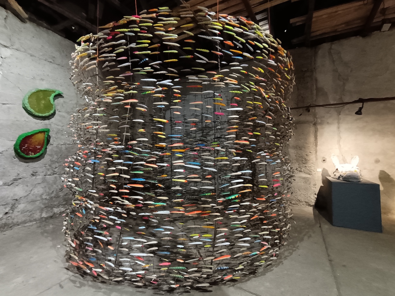 Entä kuraattori itse? Paljon erilaista veistoaihetta, suomalaisen biotaiteen ensiasteita, väriä ja muotoa mahtuu hänen maailmaansa, mutta sitten nurkassa kuhisee täysin maailman nykytaiteen näyttelyihin kelpoisen näköinen teos värikkäistä vieheistä ja metallikehikosta. Bravo.