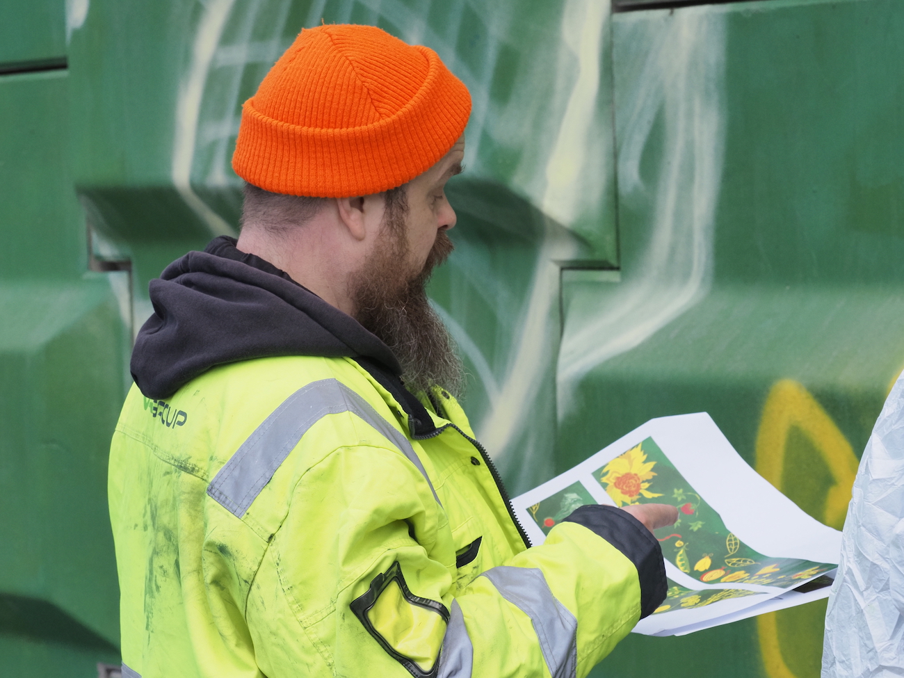 Apumiehenä on Veijo Vähätiitto, joka on ollut siirtolapuutarhan suunnasta aktiivinen muraalin saamisessa. Hän tuo avuksi työkaluja ja tikkaita. Vähätiitto on nimennyt valkohaalariset hattivateiksi. Kaikella ystävyydellä toki.