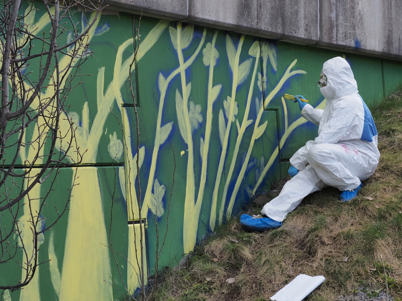 KUVATAIDE | Litukan siirtolapuutarhassa syntyi idea saada kolkkoon siltapenkereeseen kukkiva muraali. Teos valmistui keskiviikkona 21.5.2025.
