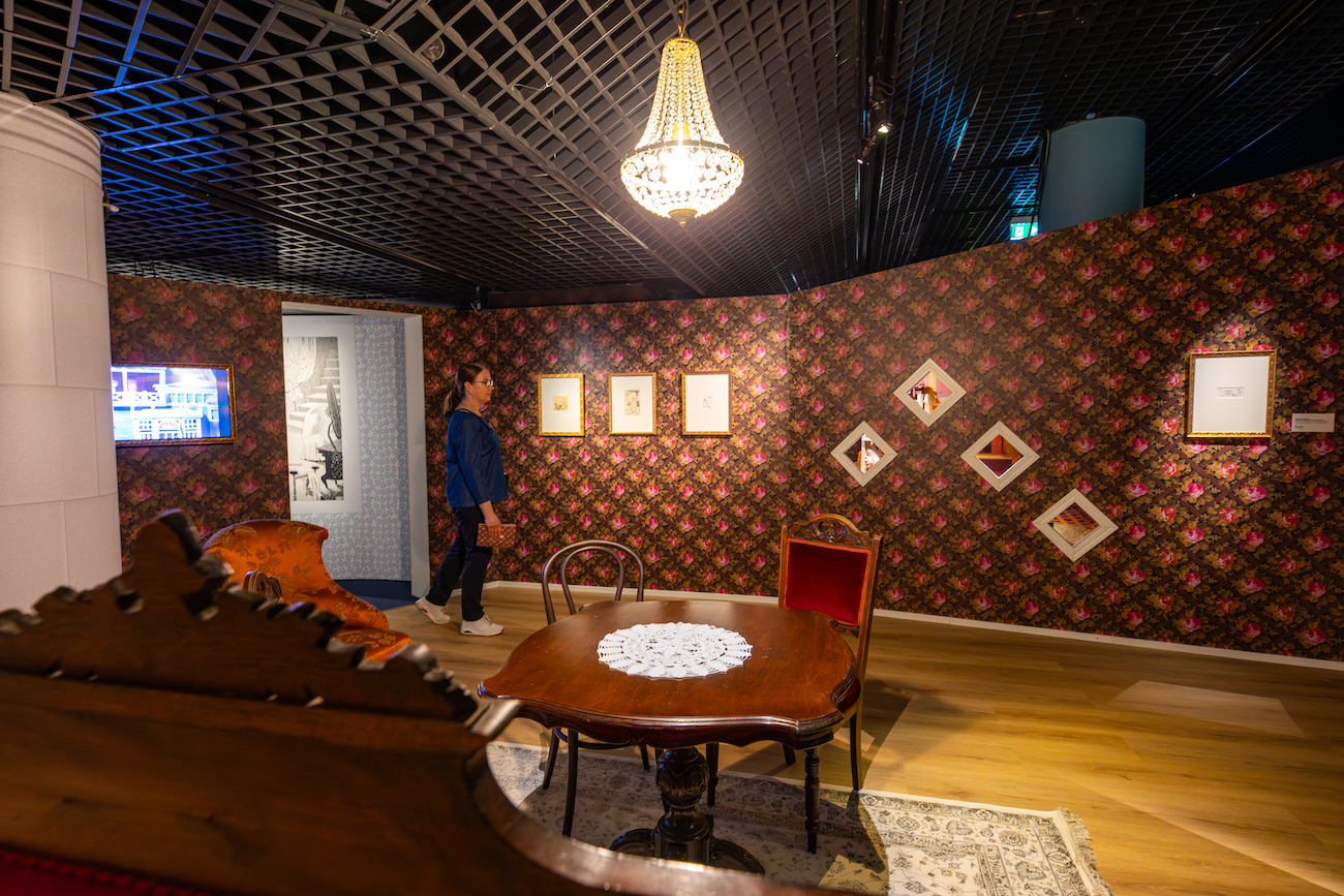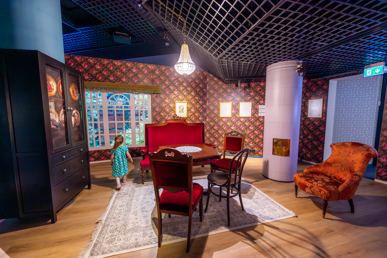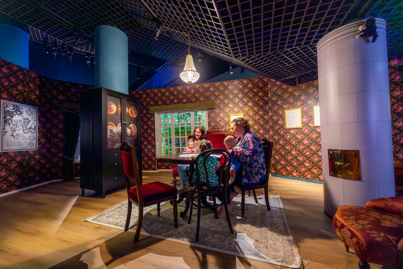 Muumi-Talosta on otettu malli aikuisten kokoiseen salonkiin ruusutapetteja, verhoja ja kalusteita myöten. Kuva: Heidi Mäenpää / Muumimuseo Tove Janssonin teoskuvat: © Moomin Characters™