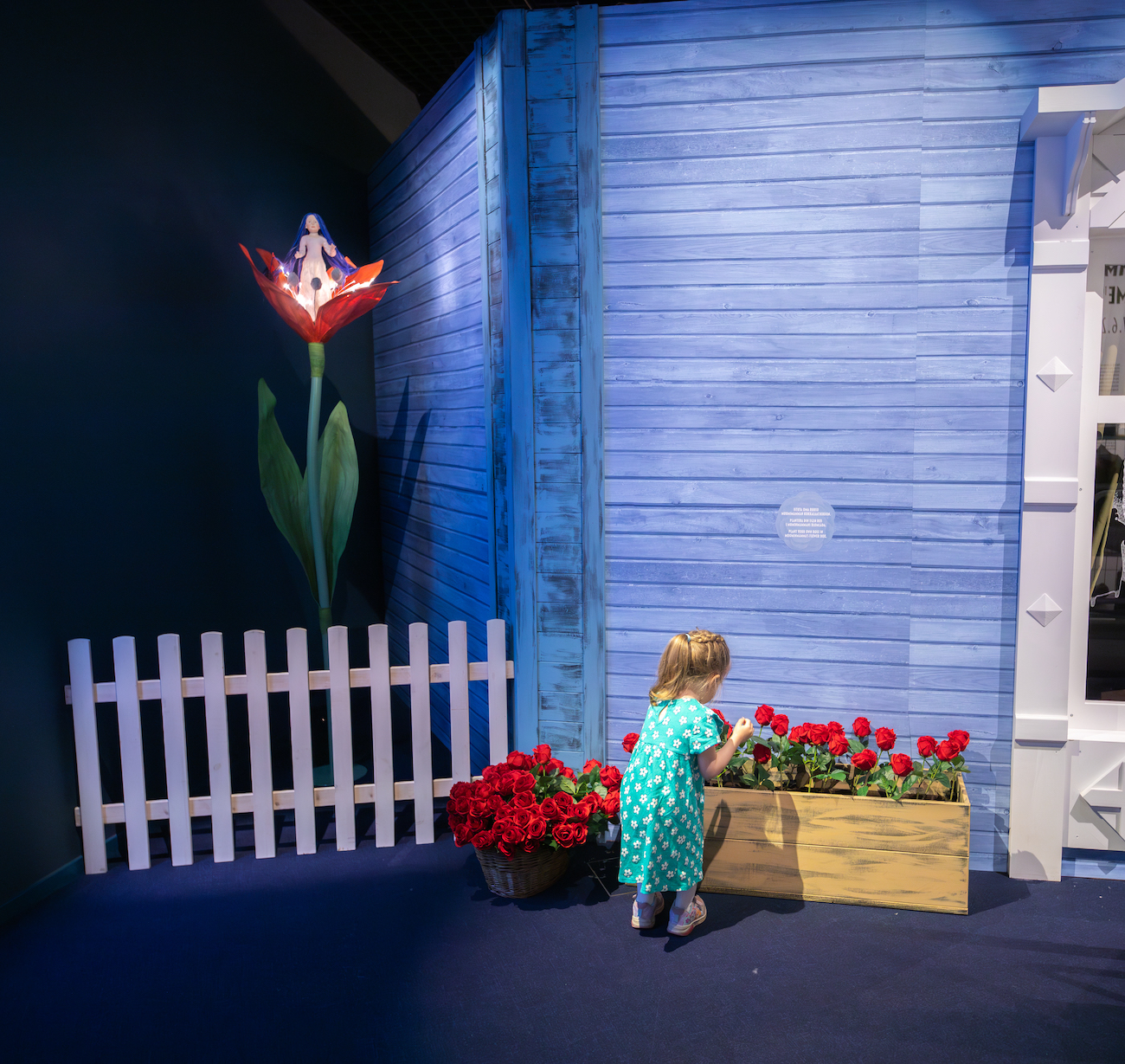 Näyttelyssä voi istuttaa ruusuja Muumimamman kukkapenkkiin. Kuva: Heidi Mäenpää / Muumimuseo. Tove Janssonin teoskuvat: © Moomin Characters™