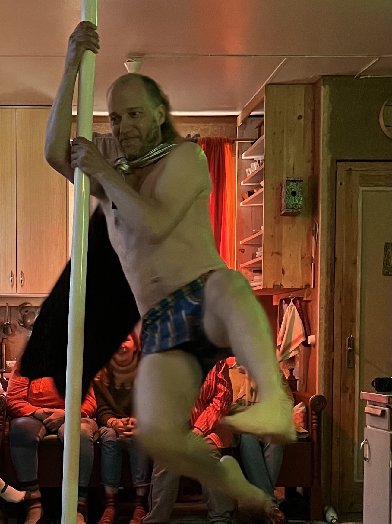 Liioittelu, kärjistäminen, kontrasti ja yllätys ovat myös huumorin keinoja. Ihmiset istuivat tuvan seinillä kolmella sivulla, elivät vahvasti mukana ja nauroivat. Miten tässä yleisössä mahdettiin ymmärtää se, että kansallispukukankaasta oli valmistettu lyhyitä urheiluhousuja? Kokonaisuudesta muodostui viihdyttävä ja arvaamaton, mutta se nosti esille myös menneiden sukupolvien aikakauden, jossa elettiin luonnon rytmin mukaan. Tämä aikakausi korostui rakenteessa pienuudellaan. Äänite oli vain pieni elementti suhteessa kokonaisuuteen, ja sitä tuki vanha tanssimusiikki, jota kuultiin Ulla Päivikön haitarista ennen varsinaista esitystä.