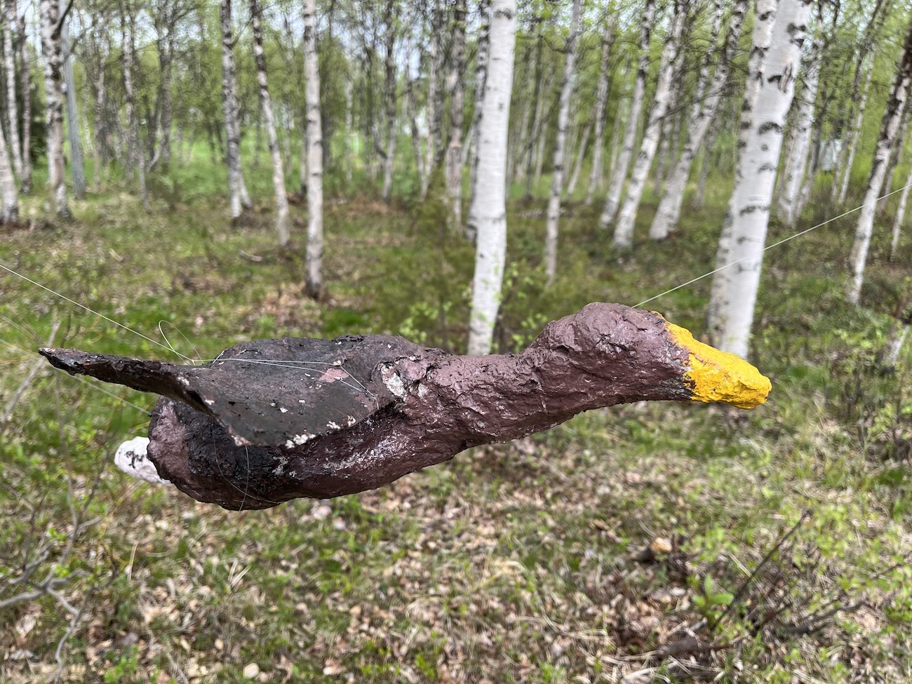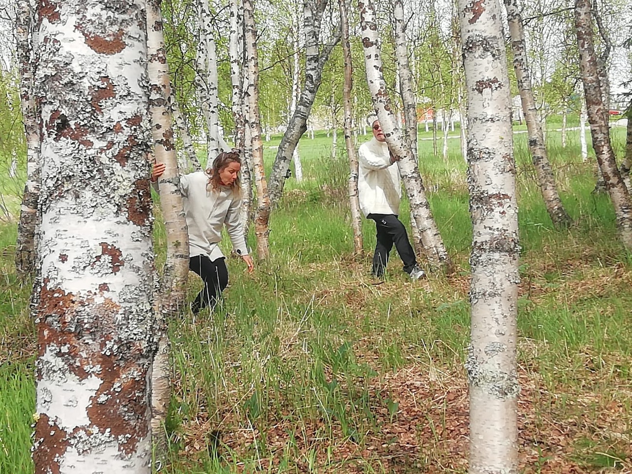 Lyhyen työskentelyn jälkeen humpsautimme lintujen pesintärauhaan liittyvän ”Lintukansan rituaalin” ottaen huomioon esityspaikan kuoppaisen maaston ja vesakon kannot. Esitimme sen tuoreeltaan koivikossa, ja elävästä ympäristöstä tuli merkityksellinen osa sisältöä. Kyse oli uhkista, jotka kohdistuvat lintujen pesintärauhaan. Kansanrunojen perusteella jo kauan sitten ihmiset ovat olleet huolissaan lintujen pesintärauhasta, jota uhkaavat metsäpalot ja tulvat.