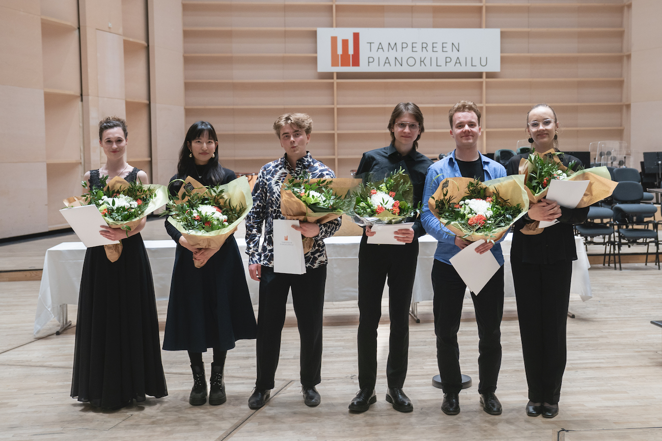 Tampereen pianokilpailun finalistit (vas.): Ella Oksava, Sadaeja Oh, Iivari Aalto, Kiryl Bartashevich, Samuel Eriksson ja Gabrielė Agilė Bajoraitė. Kuva: Ville Hautakangas
