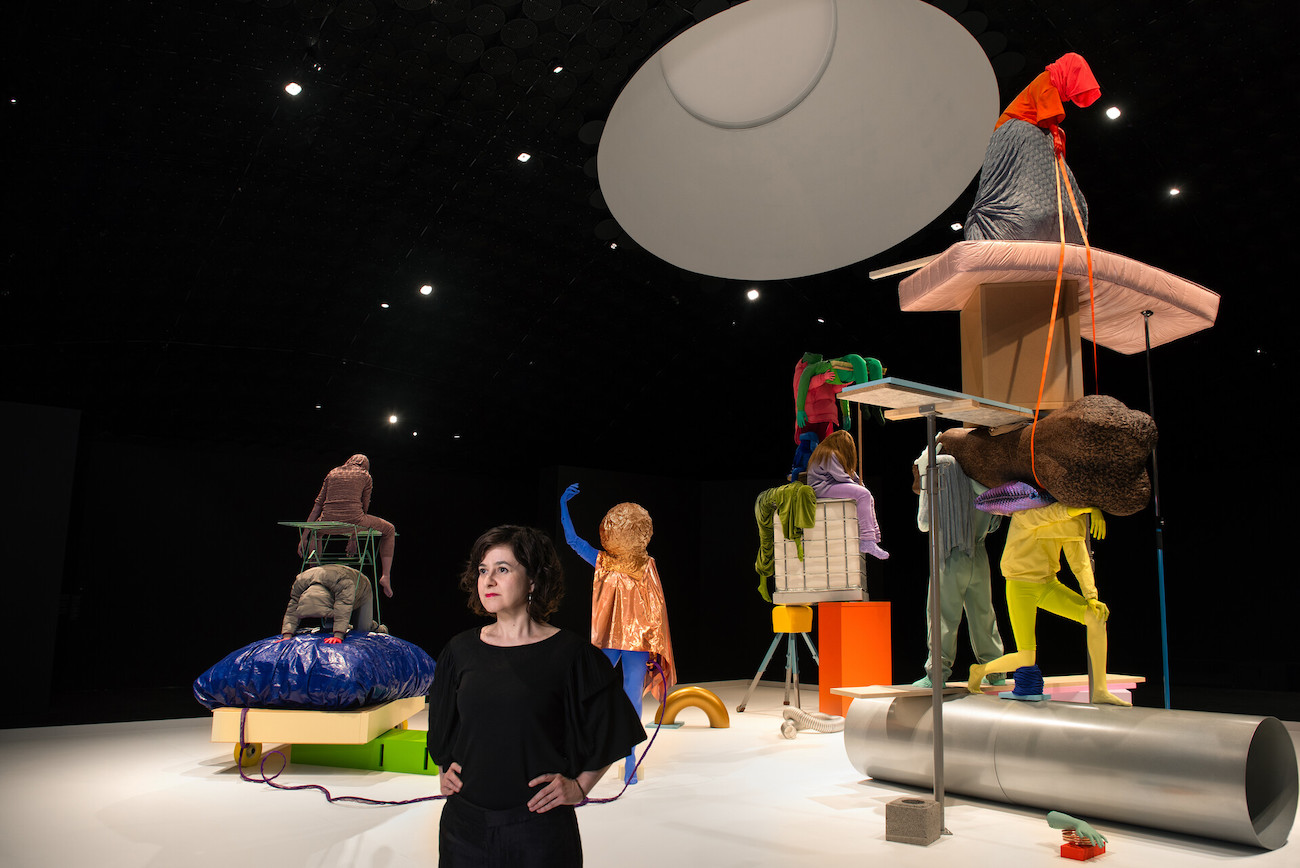 Anna Estarriola ja teos Piles of Things, 2025. Kuva: Stella Ojala / Amos Rex